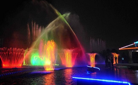 噴泉,使靜水變為動水,使水也有了靈魂,又輔之以各種燈光效果,使水體具有豐富多彩的形態,可以緩沖、軟化城市中“凝固的建筑物”和硬質的地面